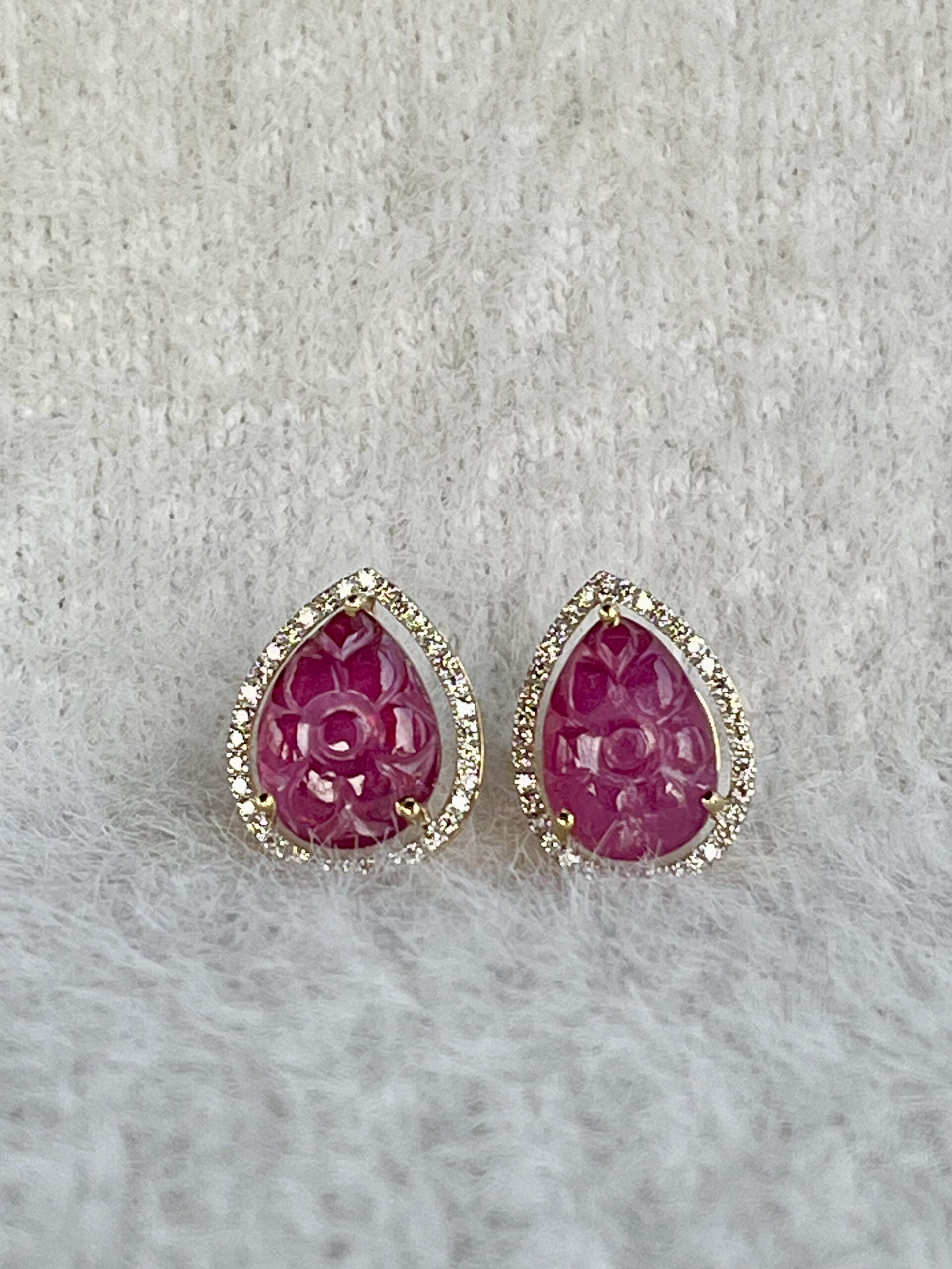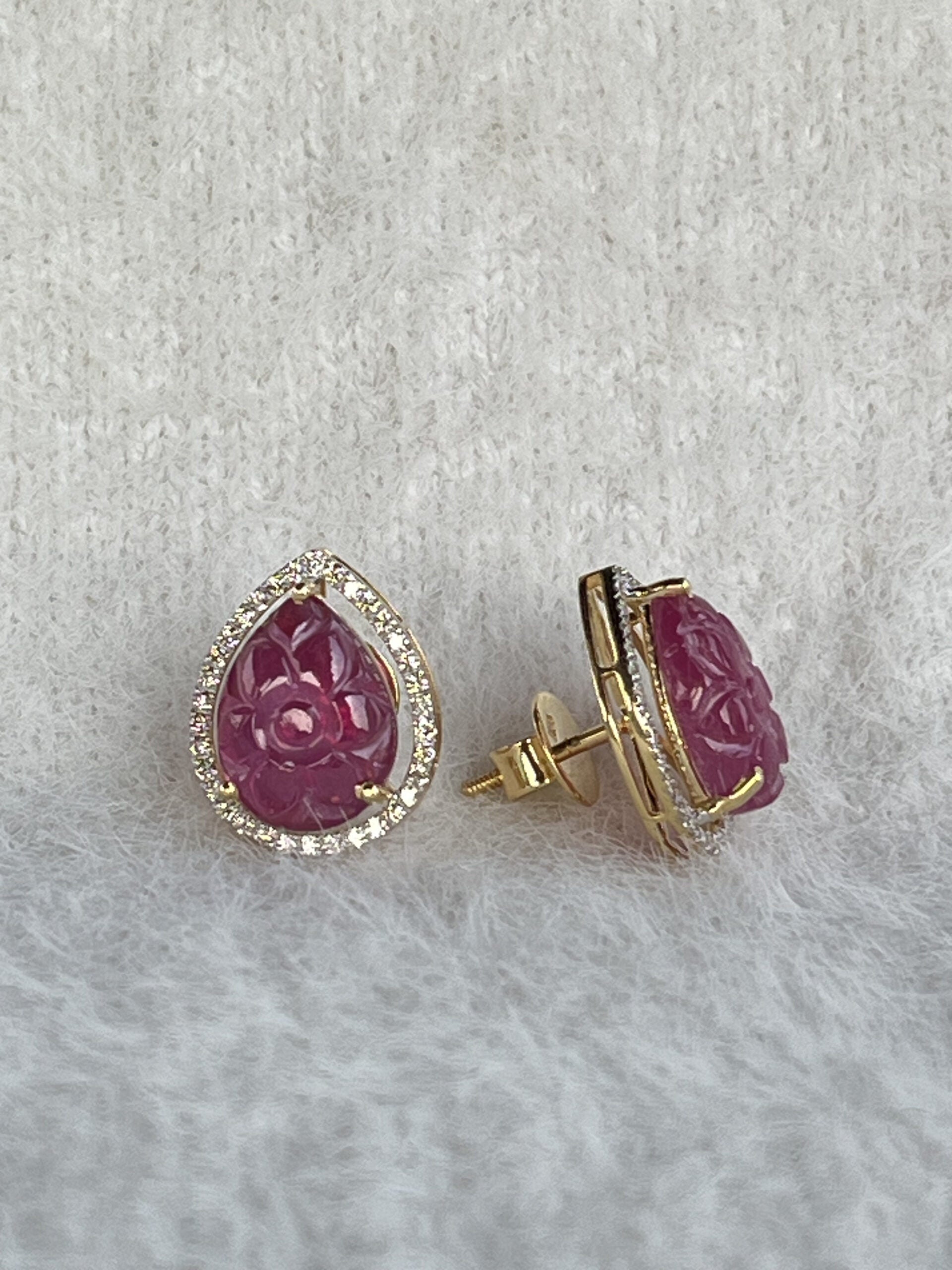 BloomRuby Earrings – 10.07 ct Carved Purplish Red Ruby & 0.45 ct Diamond Halo in 14K Gold