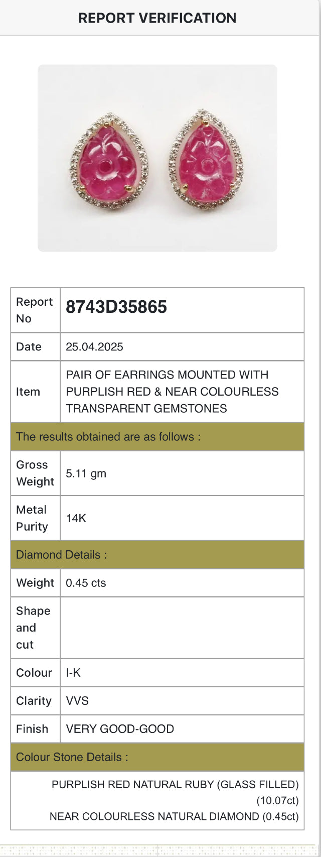 Each earring features a beautifully carved purplish red natural ruby (glass-filled) totaling 10.07 carats, shaped like blooming floral motifs. The rubies are encircled by a halo of 0.45 carats of near-colourless natural diamonds (I–K colour, VVS clarity), offering a sparkling contrast that enhances the vibrant red hue.