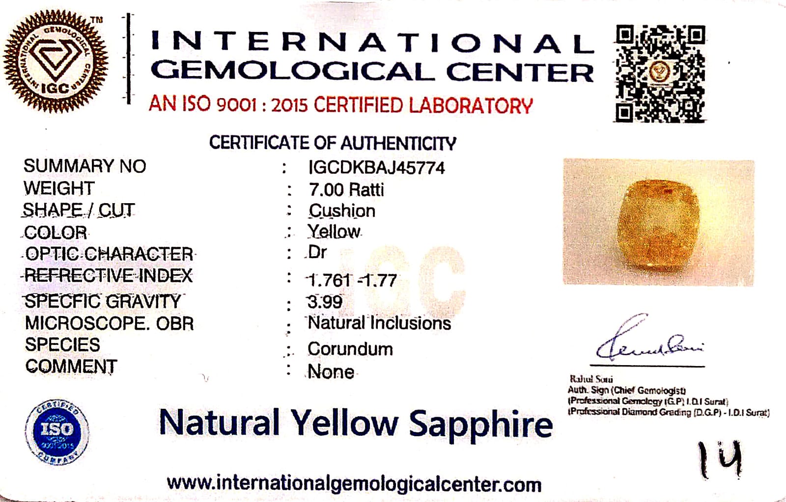 Certified by: International Gemological Center (IGC)