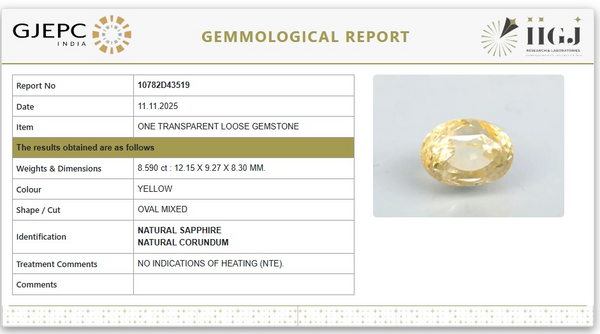 Discover the brilliance of this 9.54 Ratti ( 8.59 carats) Natural Yellow Sapphire (Pukhraj) — a vibrant yellow gemstone known for its astrological significance and natural purity. Ideal for Jyotish use, this sapphire is 100% natural with no heat treatment, preserving its original energy and charm.