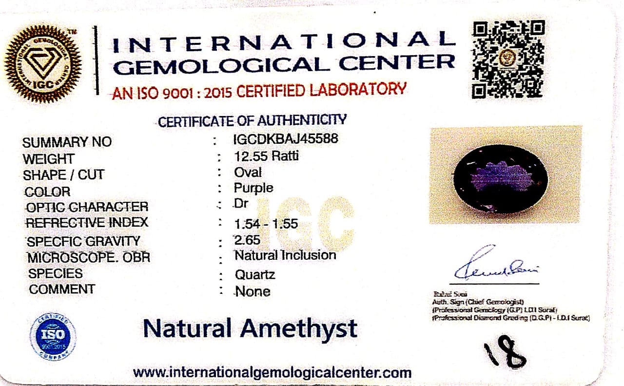 A stunning Natural Amethyst weighing 12.55 Ratti , crafted in an elegant Oval Cut. This gemstone displays a rich and vibrant purple hue with excellent transparency, making it ideal for astrological as well as jewelry purposes. Authenticated and certified by International Gemological Center (IGC), IGCDKBAJ45588 Certified, this stone guarantees purity and natural origin.