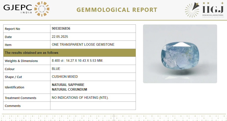 This exquisite Natural Blue Sapphire weighs 8.40 Carats and is precision-cut in a Cushion Mixed shape. Sourced and authenticated by IIGJ (GJEPC India), this gemstone is 100% natural with no indications of heating (NTE) — a rare and valuable trait in the gemstone world.