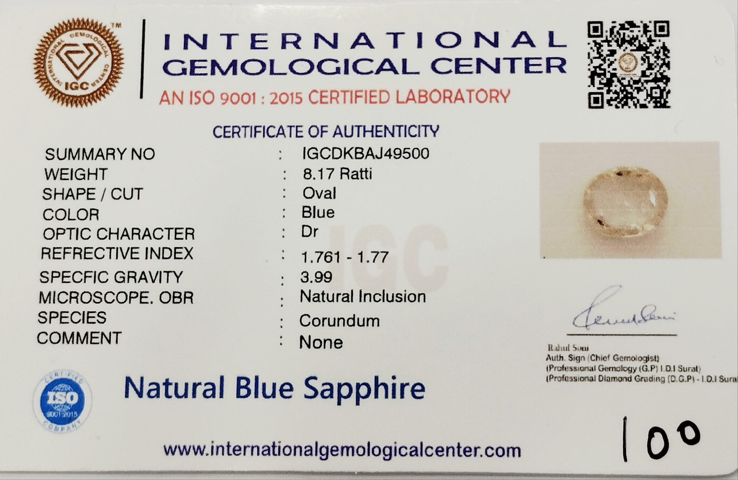 Natural Blue Sapphire | IGC...Natural Blue Sapphire | IGC Certified | Oval Cut | Deep Blue | Natural Inclusions | Premium Astrological Gemstone Certificate No.: IGCDKBAJ49500