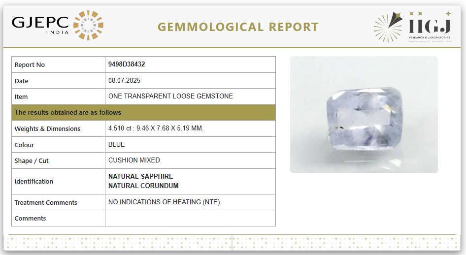 Certified by GJEPC India (Report No. 9498D38432), this gemstone is 100% natural corundum and shows no signs of heating (NTE), ensuring authenticity and high gem quality.