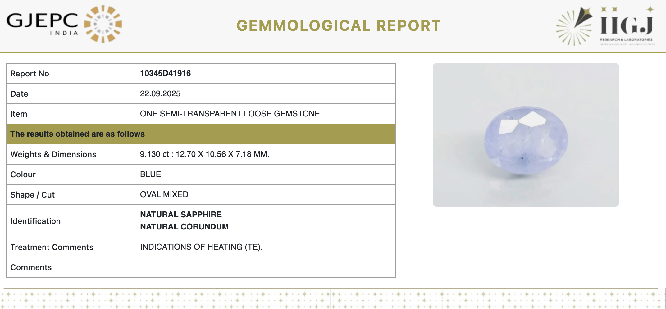 Certified by GJEPC India (Report No. 10345D41916), this gemstone is 100% natural corundum and shows no signs of heating (NTE), ensuring authenticity and high gem quality.