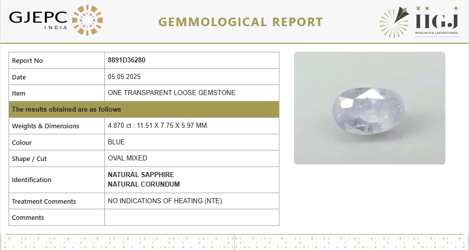 This 5.41 Ratti (4.870 ct) Natural Blue Sapphire (Neelam) is a stunning transparent gemstone, offering powerful astrological benefits aligned with Shani (Saturn). Fully natural, unheated, and untreated, this sapphire is certified for its authenticity and purity by GJEPC India.