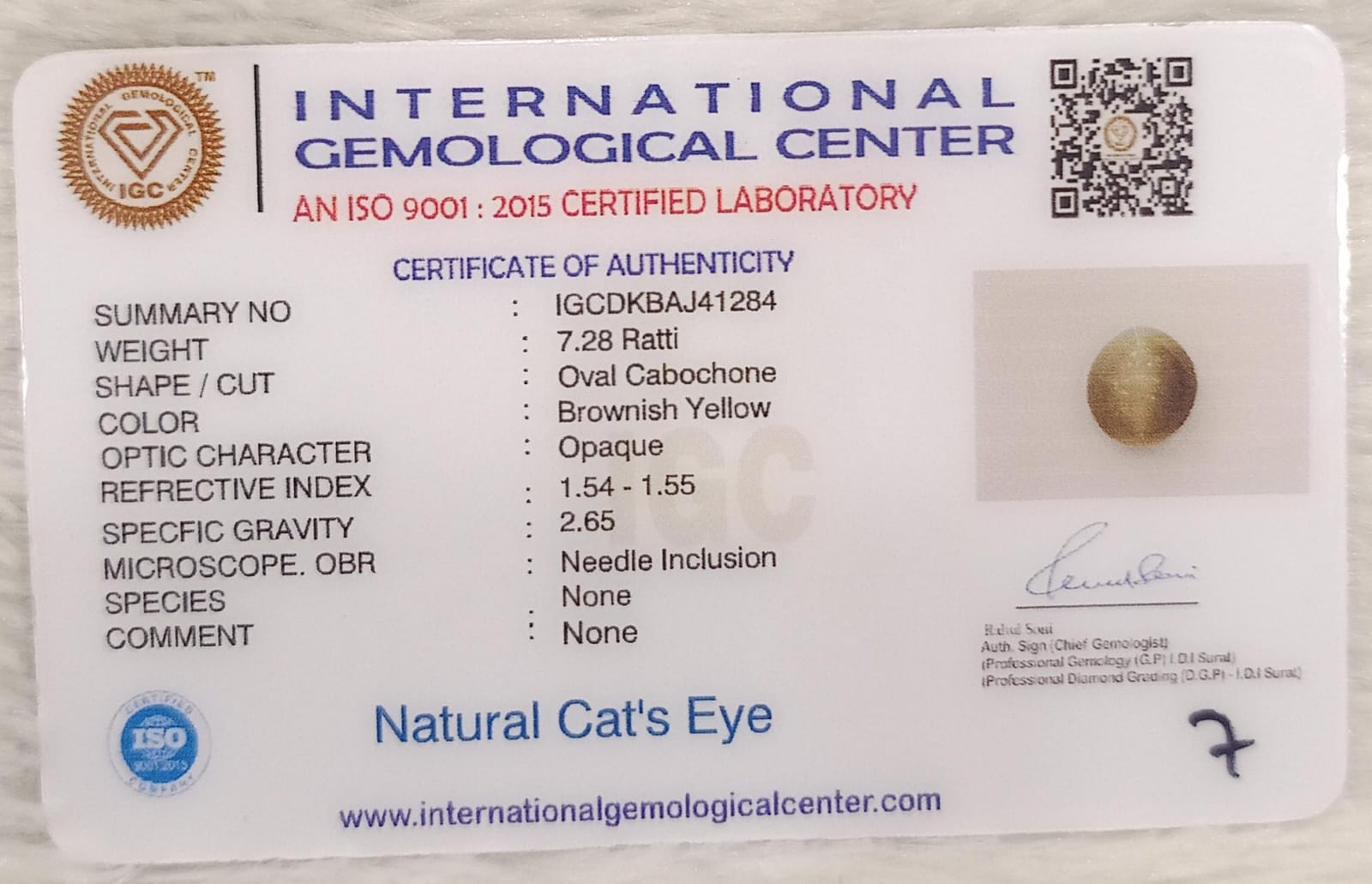 - Astrological Significance In Vedic astrology, Cat's Eye is the gemstone of Ketu, which governs spiritual wisdom, detachment, and inner peace. Wearing a 7.28 Ratti Natural Cat’s Eye can help reduce the malefic effects of Ketu, bringing relief from challenges related to unexpected obstacles, financial instability, and mental confusion. It is especially beneficial during Ketu Mahadasha or periods when Ketu exerts a strong influence in your birth chart.