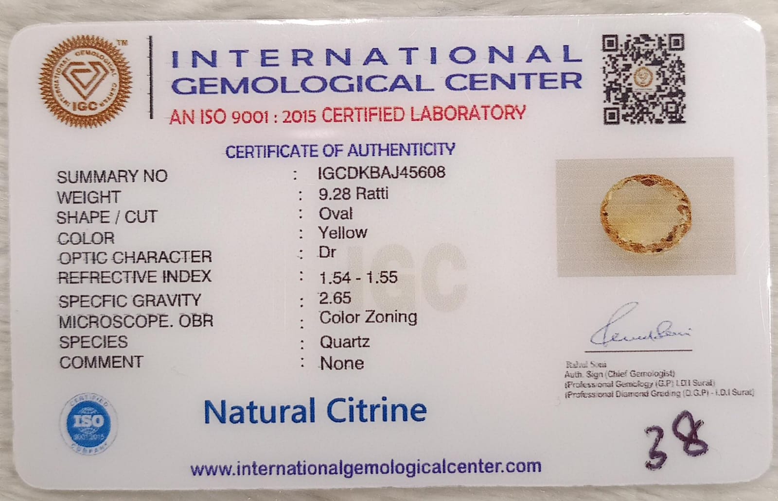 Citrine is a variety of quartz that gets its golden-yellow hue from trace amounts of iron in its crystal structure. Its name comes from the French word “citron,” meaning lemon, a reference to its vibrant color. While natural citrine is relatively rare, it is highly sought after for its ability to energize and cleanse the body, mind, and spirit. The 9.28 Ratti natural citrine we offer is untouched by artificial treatments, making it a valuable and pure gemstone.