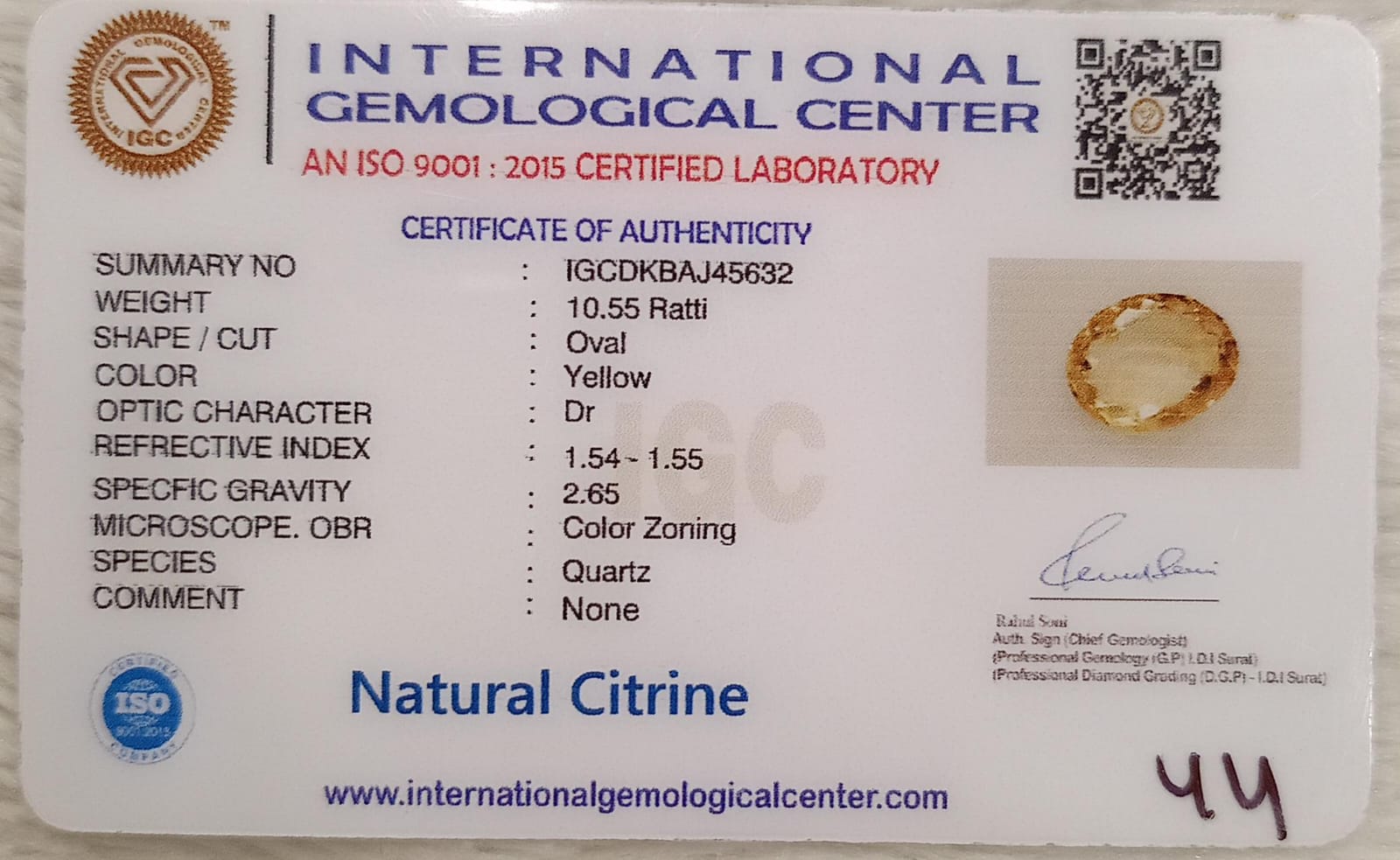 Citrine is a variety of quartz that gets its golden-yellow hue from trace amounts of iron in its crystal structure. Its name comes from the French word “citron,” meaning lemon, a reference to its vibrant color. While natural citrine is relatively rare, it is highly sought after for its ability to energize and cleanse the body, mind, and spirit. The 10.55 Ratti natural citrine we offer is untouched by artificial treatments, making it a valuable and pure gemstone.