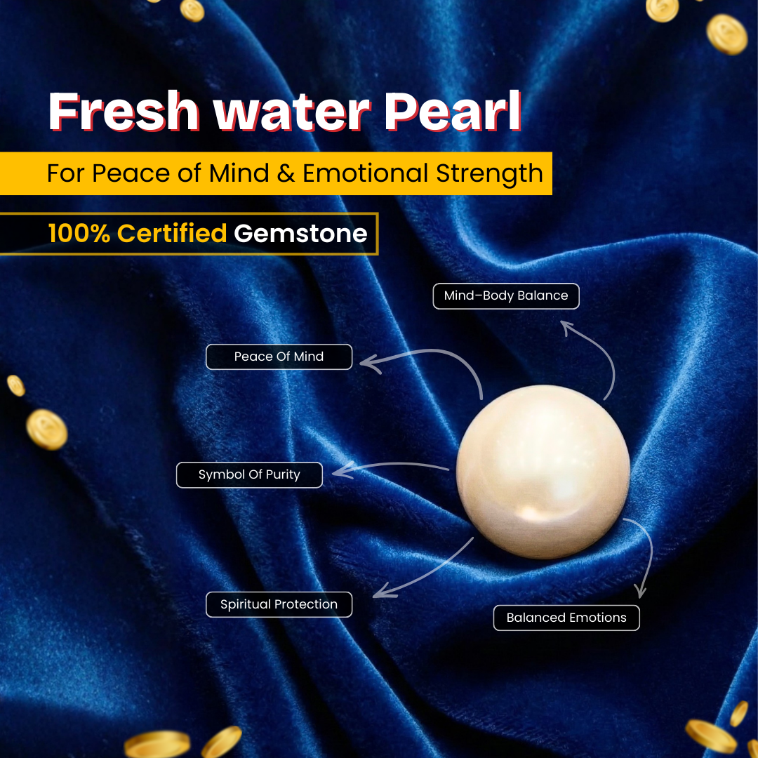Pearls are traditionally associated with the Moon (Chandra). Wearing a genuine pearl is believed to enhance emotional stability, peace of mind, intuition, and mental clarity while reducing stress and emotional imbalance.