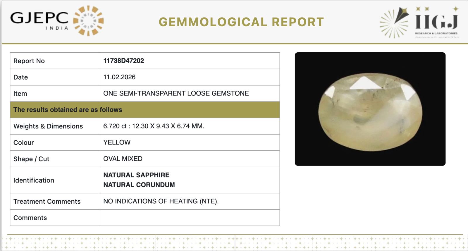 Natural Yellow Sapphire | Oval Mixed | Transparent | Govt. Lab Certified | Report No. 11738D47202