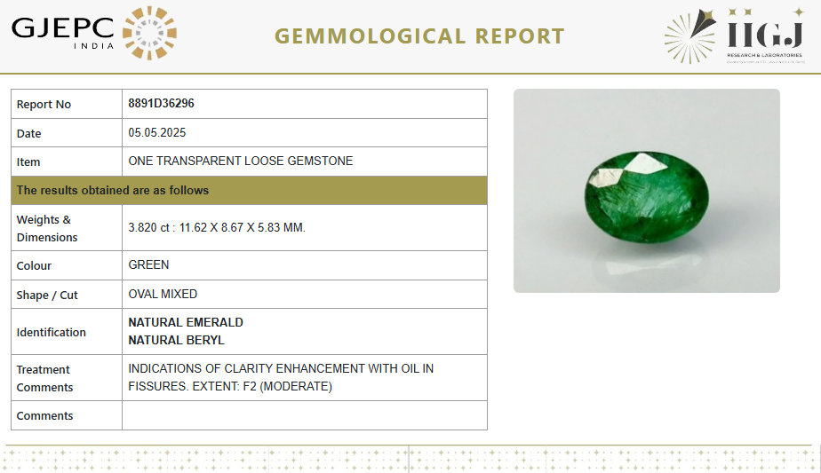 Certified Natural Emerald weighing 3.820 carats, equivalent to 4.24 Ratti, authenticated by a Government-approved gemological laboratory. This transparent green gemstone features an oval mixed cut, showcasing its natural brilliance. Moderate oil treatment (F2) has been applied to enhance clarity — a common and accepted practice for emeralds.