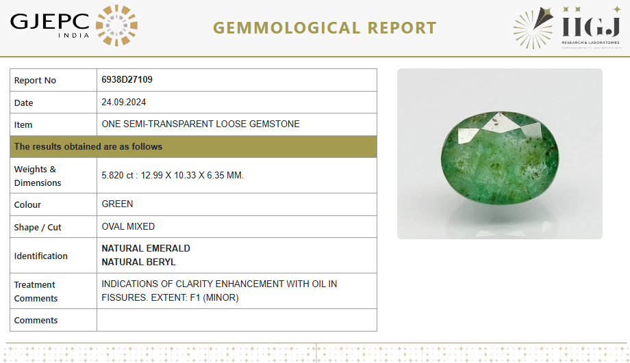 This 5.820 carat (6.47 Ratti) Natural Emerald is beautifully cut in an Oval Mixed shape, showcasing a vibrant green color. With minor clarity enhancement (F1) using oil in fissures, it retains high natural quality and appeal. Certified by a reputed Government Lab, this semi-transparent gemstone is a great choice for fine jewelry or astrological benefits.