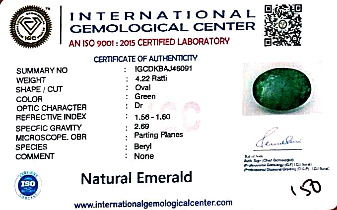 A vibrant Natural Emerald weighing 4.22 Ratti (3.80 carats), crafted in an elegant Oval Cut , exhibiting a lovely green hue with translucent clarity. This gemstone has undergone moderate clarity enhancement (F2) with oil, as verified by a Govt. Lab Certificate (Report No. IGCDKBAJ46091)