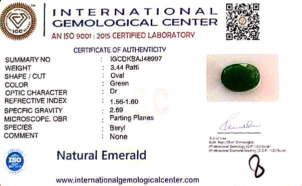 A vibrant Natural Emerald weighing 3.44 Ratti (3.10carats), crafted in an elegant Oval Cut, exhibiting a lovely green hue with translucent clarity. This gemstone has undergone moderate clarity enhancement (F2) with oil, as verified by a Govt. Lab Certificate (Report No. IGCDKBAJ48997)