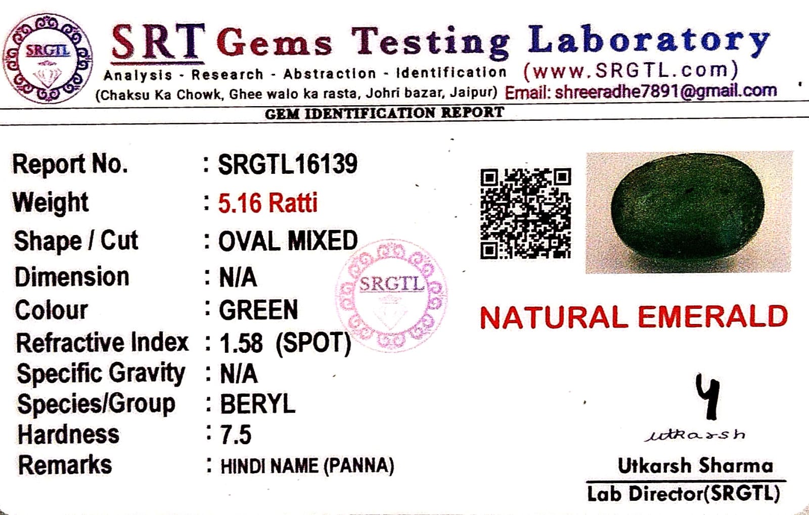 A vibrant Natural Emerald weighing 5.16 Ratti (4.65 carats), crafted in an elegant Oval Cut , exhibiting a lovely green hue with translucent clarity. This gemstone has undergone moderate clarity enhancement (F2) with oil, as verified by a Govt. Lab Certificate (Report No. SRGTL16139)