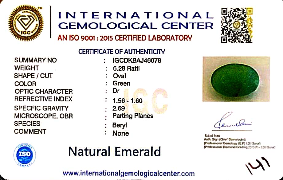 A vibrant Natural Emerald weighing 6.28 Ratti (5.65 carats), crafted in an elegant Oval , exhibiting a lovely green hue with translucent clarity. This gemstone has undergone moderate clarity enhancement (F2) with oil, as verified by a Govt. Lab Certificate (Report No. IGCDKBAJ46078)