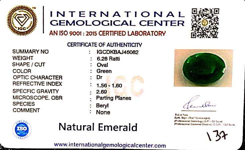 A vibrant Natural Emerald weighing 6.28 Ratti (5.65 carats), crafted in an elegant Oval , exhibiting a lovely green hue with translucent clarity. This gemstone has undergone moderate clarity enhancement (F2) with oil, as verified by a Govt. Lab Certificate (Report No. IGCDKBAJ46082)