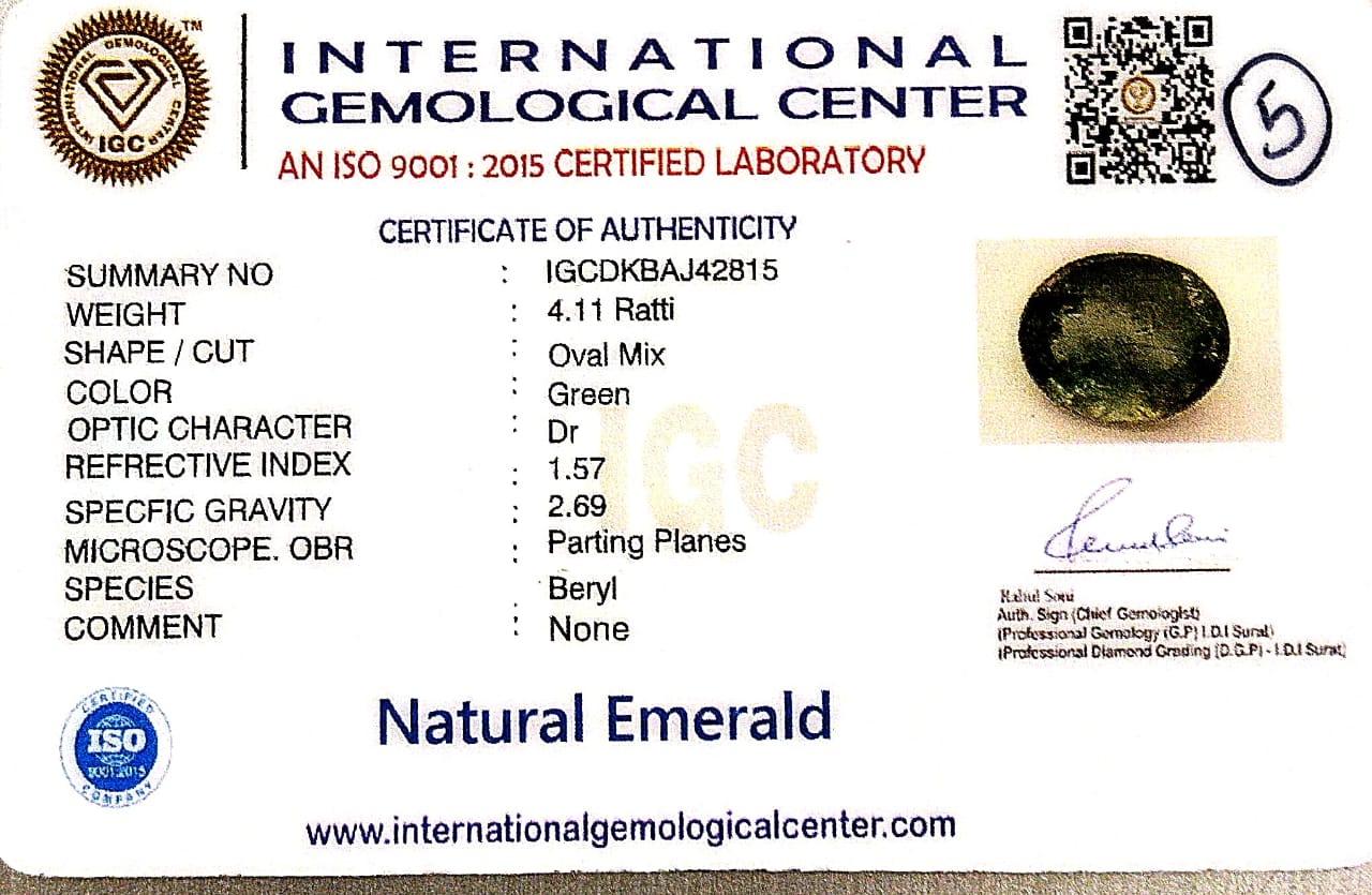 A vibrant Natural Emerald weighing 4.11 Ratti (3.70 carats), crafted in an elegant Oval Mix , exhibiting a lovely green hue with translucent clarity. This gemstone has undergone moderate clarity enhancement (F2) with oil, as verified by a Govt. Lab Certificate (Report No. IGCDKBAJ42815)