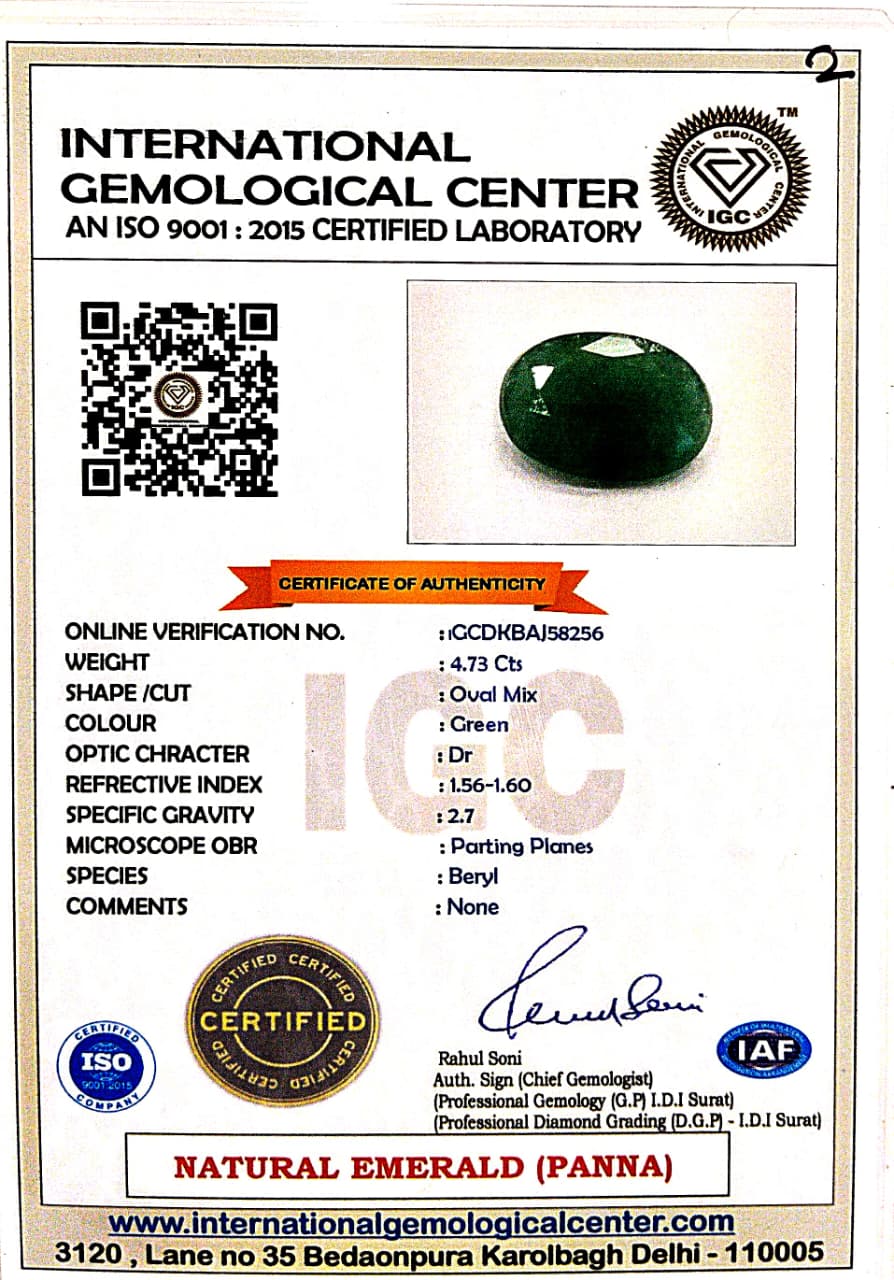 A vibrant Natural Emerald weighing 5.26 Ratti (4.73 carats), crafted in an elegant Oval Mix , exhibiting a lovely green hue with translucent clarity. This gemstone has undergone IGC . Lab Certificate (Report No. IGCDKBAJ58256)