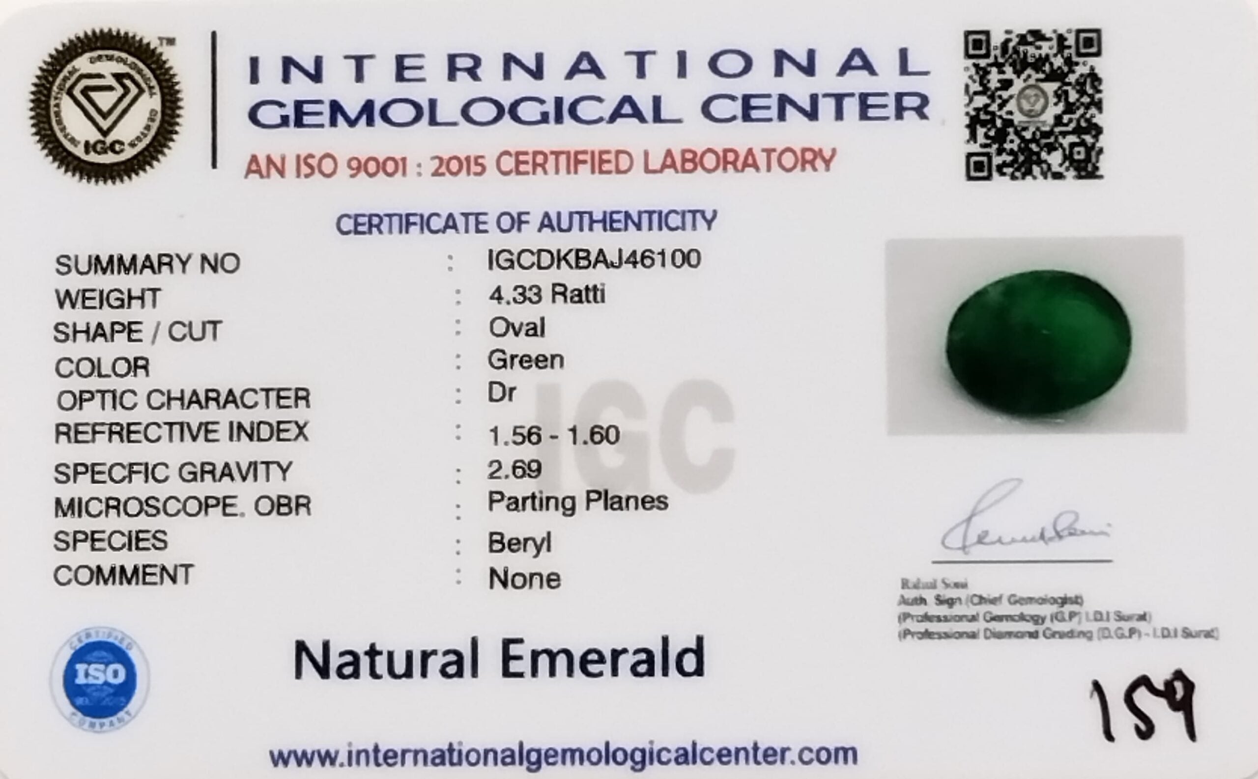 A vibrant Natural Emerald weighing 4.33 Ratti (3.90carats), crafted in an elegant Oval Cut, exhibiting a lovely green hue with translucent clarity. This gemstone has undergone moderate clarity enhancement (F2) with oil, as verified by a Govt. Lab Certificate (Report No. IGCDKBAJ46100)