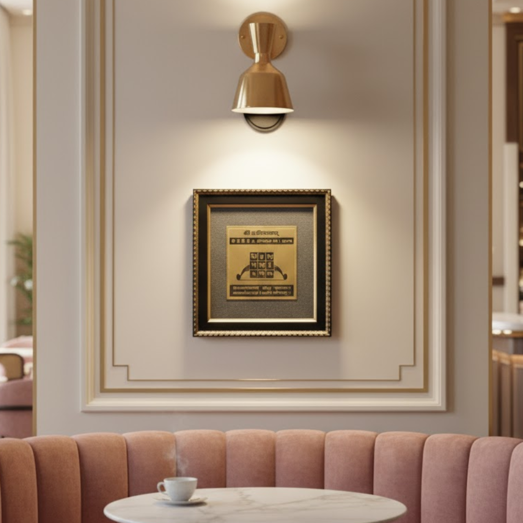 • Premium Framing: The yantra is elegantly set within a sleek, classic black and gold frame. The surrounding textured panel has a shimmering Pyrite-like finish, giving the piece a rich, sophisticated appearance.