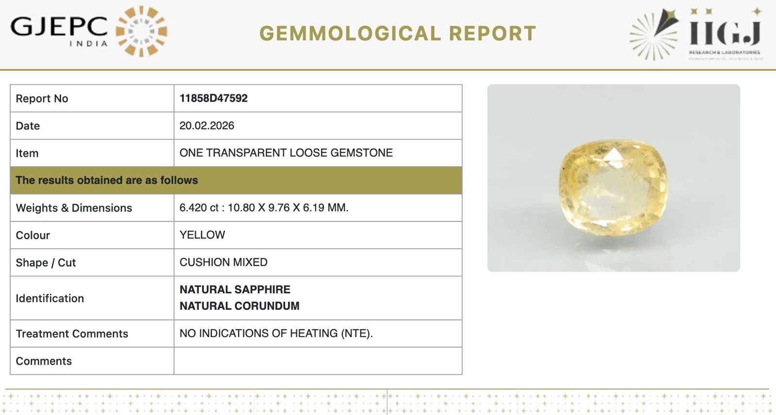 Discover the brilliance of this 7.13 Ratti (6.42 carats) Natural Yellow Sapphire (Pukhraj) — a vibrant yellow gemstone known for its astrological significance and natural purity. Ideal for Jyotish use, this sapphire is 100% natural with no heat treatment, preserving its original energy and charm.