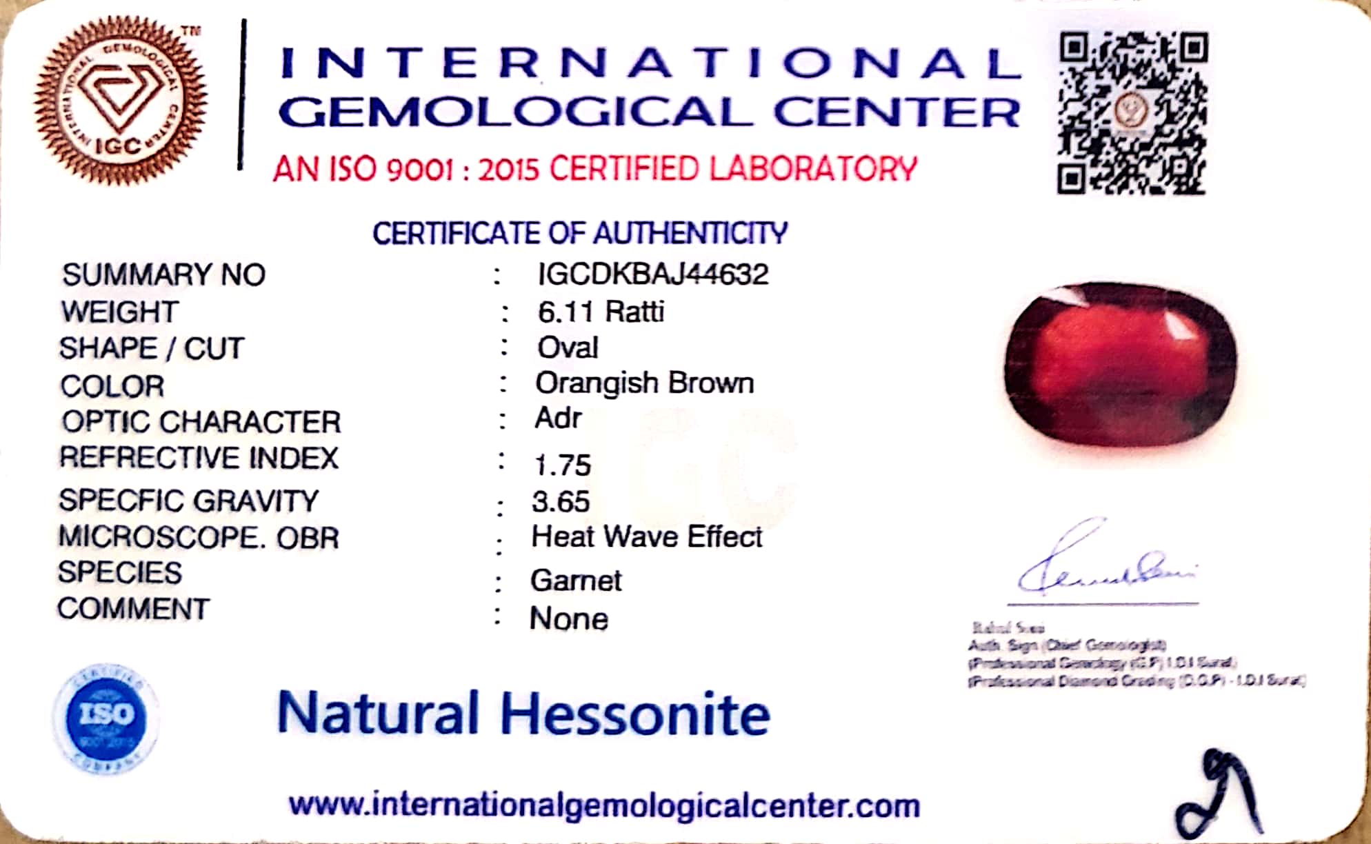 Natural Hessonite Garnet | ...Natural Hessonite Garnet | Oval Cut | Orangish Brown Certificate No.: IGCDKBAJ44632