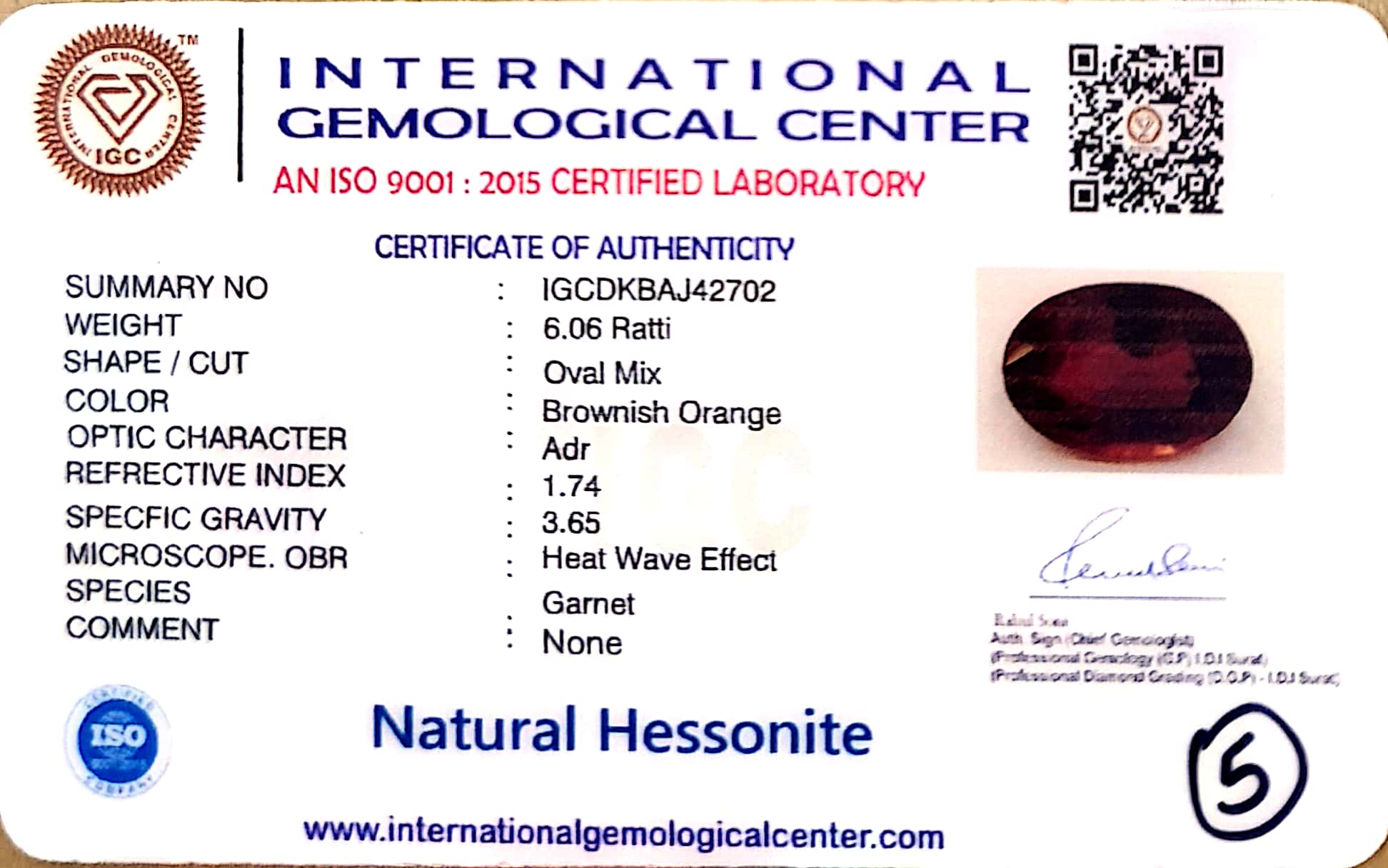 This 6.06 Ratti Natural Hessonite (Gomed) is a finely cut gemstone, certified by the International Gemological Center (IGC). With an elegant Oval Mix cut and a rich Brownish Orange hue, it offers both visual appeal and powerful astrological benefits.