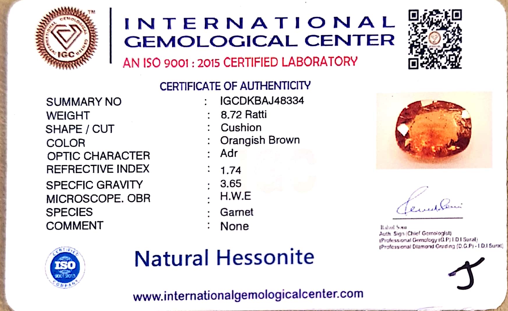 Introducing a Natural Hessonite (Gomed) gemstone weighing 8.72 Ratti, certified by the International Gemological Center (IGC). This gemstone features a brilliant Cushion Cut and a striking Orangish Brown hue, known to enhance spiritual and astrological benefits. The stone shows a visible Heat Wave Effect (H.W.E), confirming its authenticity and natural origin.