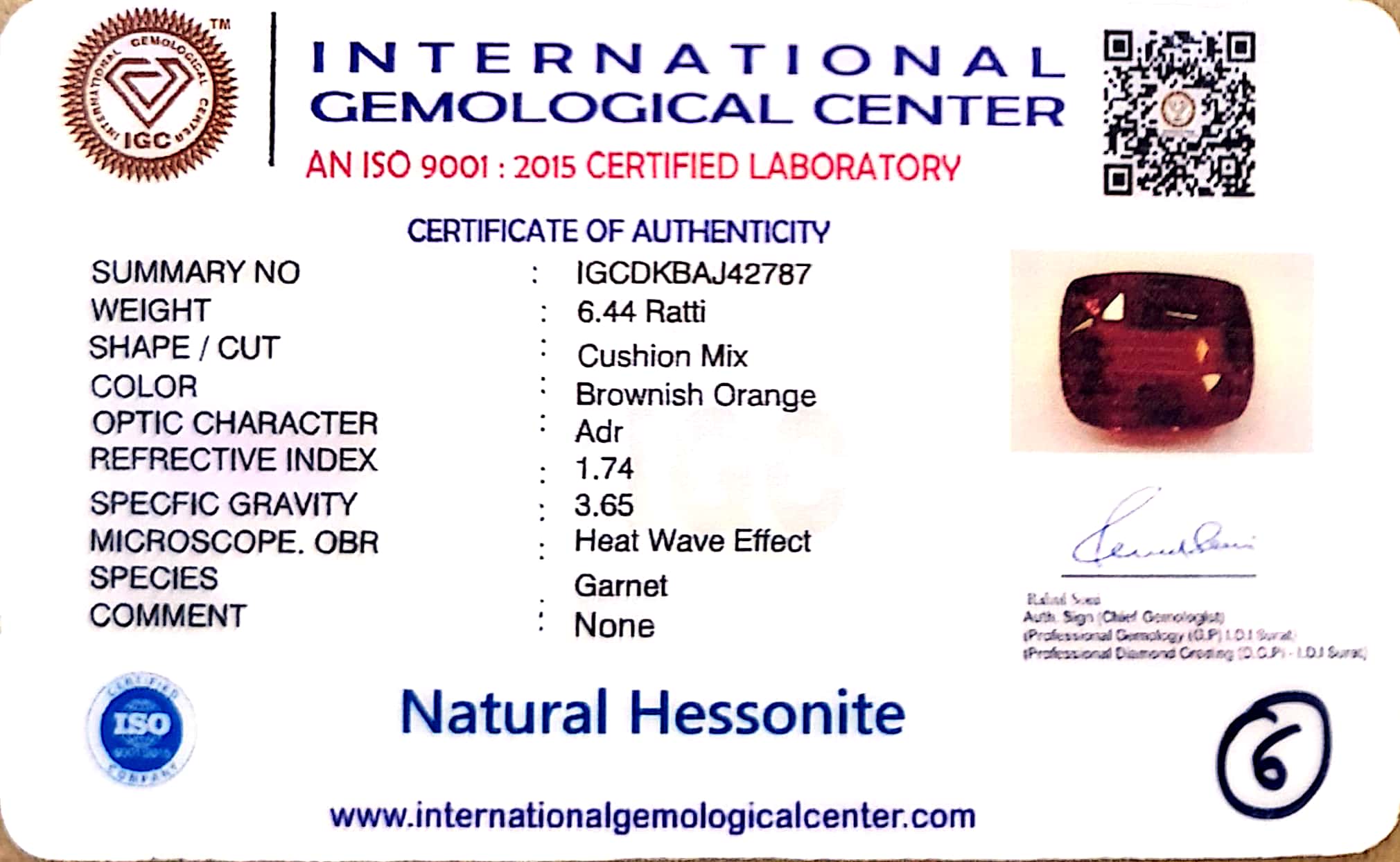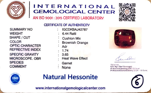 This exquisite 6.44 Ratti Natural Hessonite (Gomed), certified by the International Gemological Center (IGC), features a refined Cushion Mix cut and a rich Brownish Orange hue. Known for its Heat Wave Effect under microscopic observation, this stone reflects both authenticity and high astrological value.