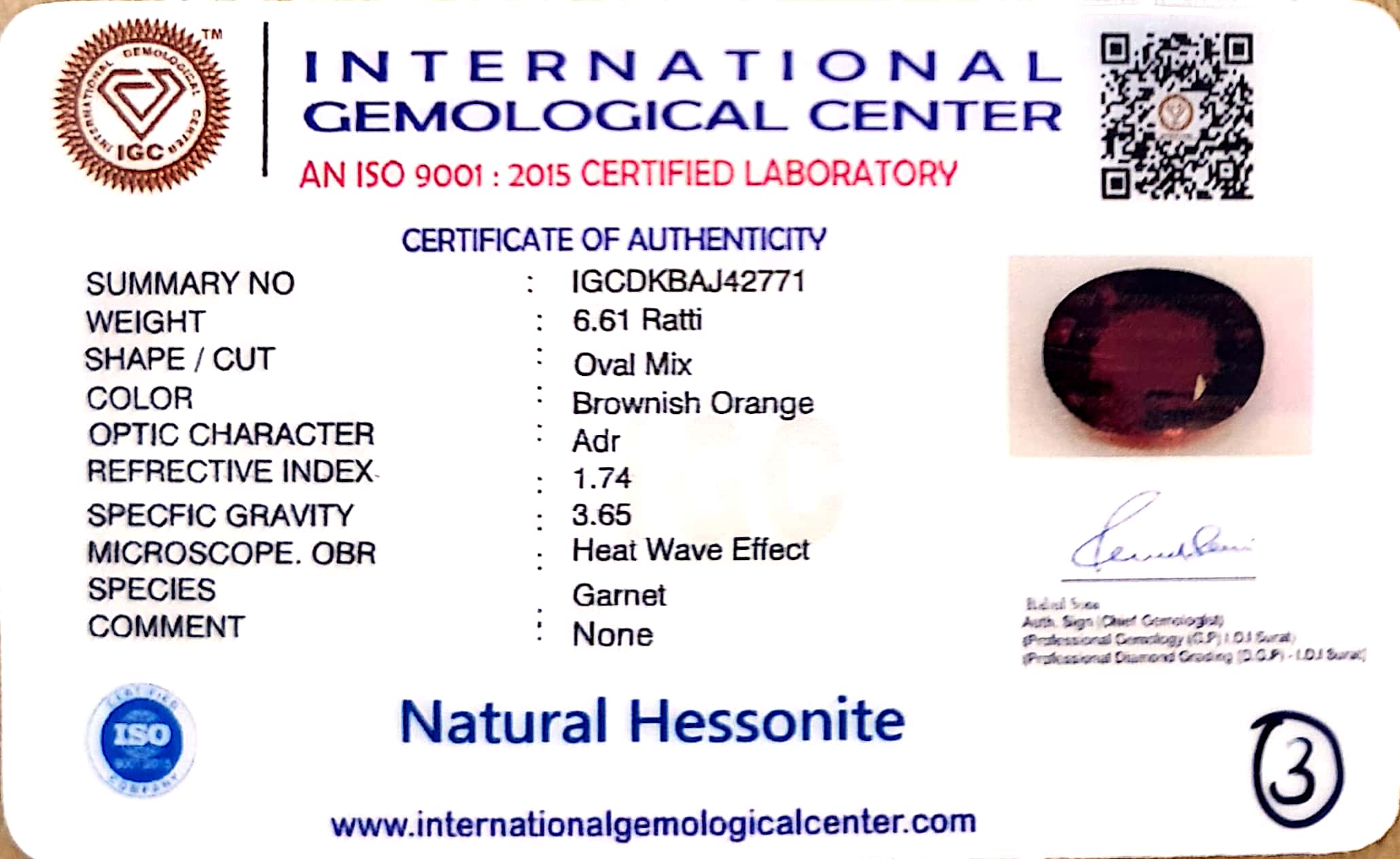 This 6.61 Ratti Natural Hessonite (Gomed), certified by the International Gemological Center (IGC), features an Oval Mix cut that highlights its rich Brownish Orange hue. Known for its astrological value and visual charm, this gemstone displays the distinctive Heat Wave Effect under magnification.