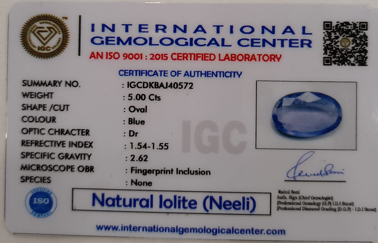 This striking Natural Iolite gemstone weighs 5.55 Ratti and is cut in a classic Oval . Known for its deep blue hue . It is certified for authenticity and contains natural inclusions, affirming its genuine origin.