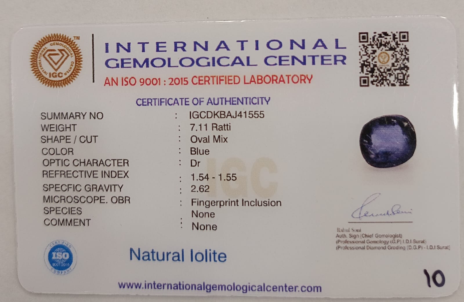 This striking Natural Iolite gemstone weighs 7.11 Ratti and is cut in a classic Oval Mix . Known for its deep blue hue . It is certified for authenticity and contains natural inclusions, affirming its genuine origin.
