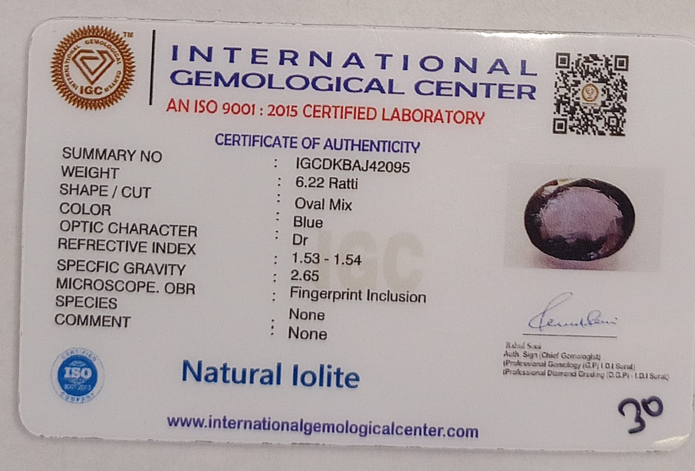 This striking Natural Iolite gemstone weighs 6.22 Ratti and is cut in a classic Oval Mix . Known for its deep blue hue . It is certified for authenticity and contains natural inclusions, affirming its genuine origin.