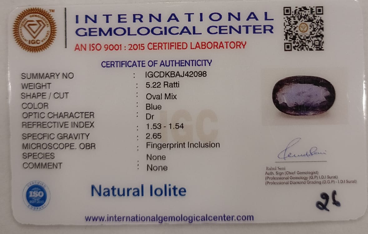 This striking Natural Iolite gemstone weighs 5.22 Ratti and is cut in a classic Oval Mix . Known for its deep blue hue . It is certified for authenticity and contains natural inclusions, affirming its genuine origin.