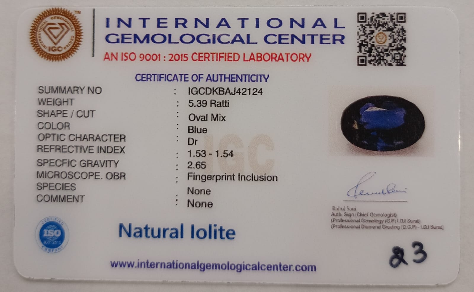 Certified by: International Gemological Center (IGC)