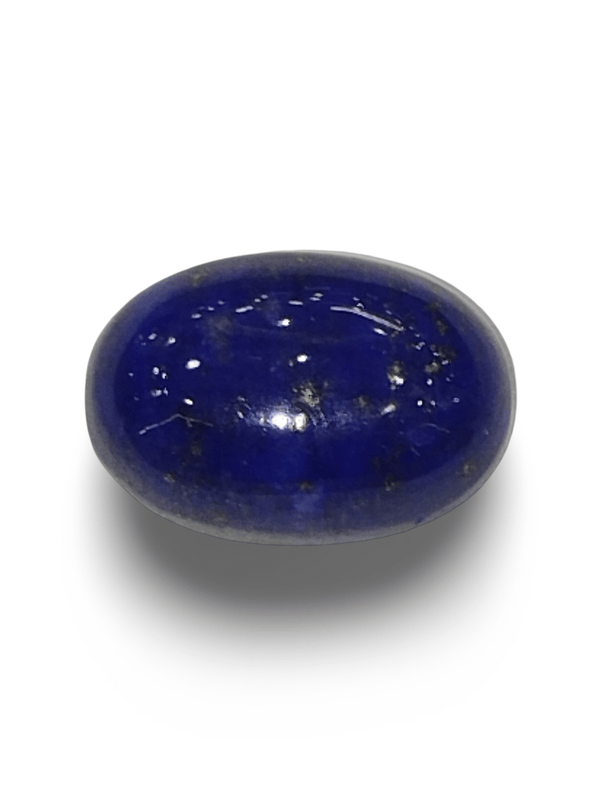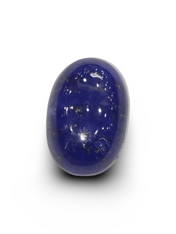 This 7.06 Ratti Natural Lapis Lazuli is a beautifully crafted gemstone in a polished oval cabochon shape, exhibiting a deep blue hue enriched with subtle, shimmering metallic pyrite crystals. The stone's opaque nature gives it a strong, grounding appearance, making it perfect for astrological and spiritual use.