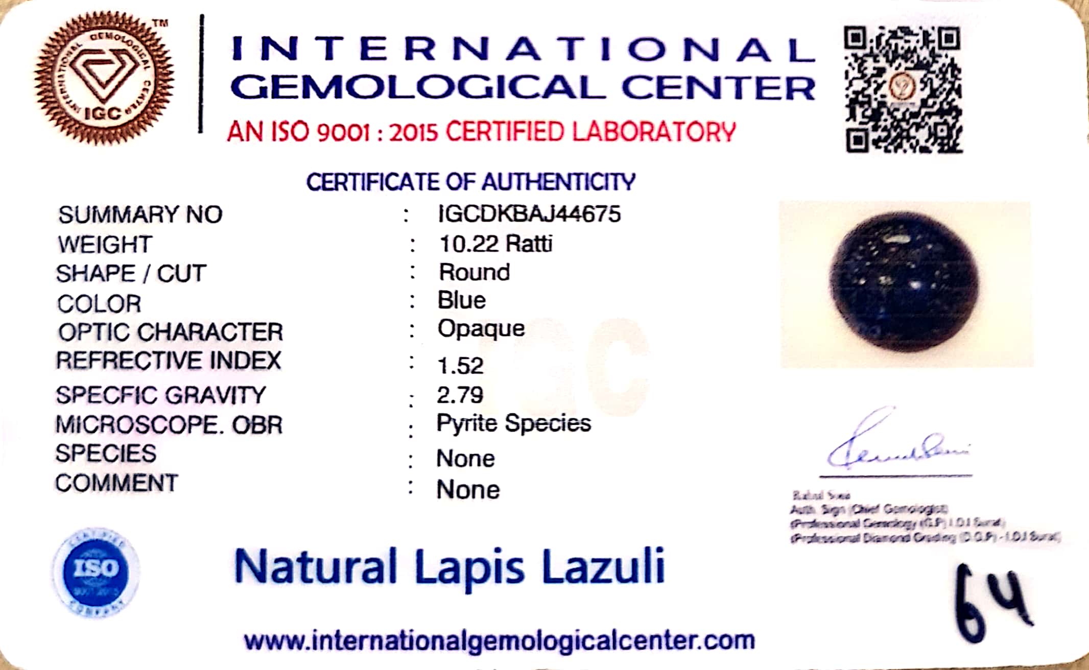 Natural Lapis Lazuli | Oval...Natural Lapis Lazuli | Round Cabochon | IGC Certified Certificate No.: IGCDKBAJ44675