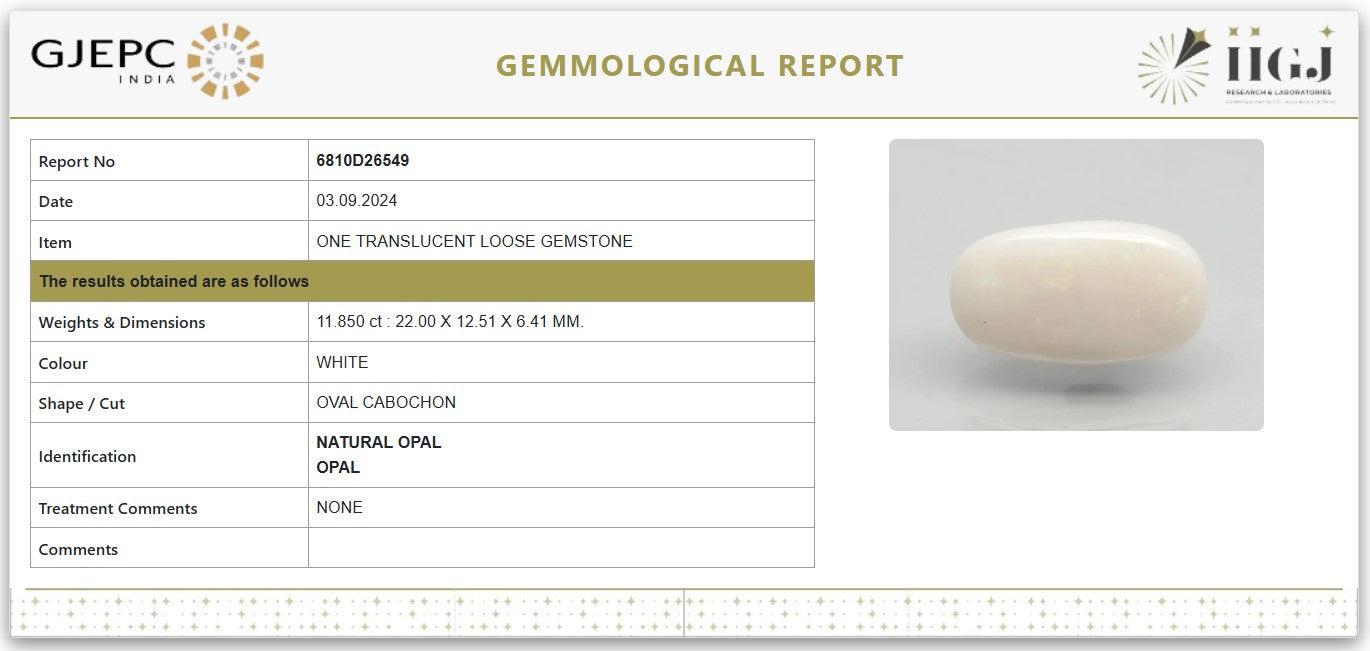 This 11.85 carat fire opal displays a subtle iridescence and refined polish in a classic oval cabochon cut. Certified as natural and untreated by GJEPC India (IIGJ Laboratory), this gemstone exemplifies the serene elegance and metaphysical significance that white opals are known for. Perfect for astrological use or crafting into luxury jewelry.