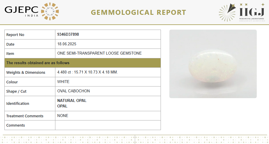 This Natural Fire Opal, weighing 4.98 Ratti (approx. 4.48 carats), features a stunning semi-transparent appearance with subtle play-of-color and a smooth Oval Cabochon cut. An ideal gemstone for elegant jewelry and astrological purposes, this opal is untreated and certified by GJEPC-IIGJ, ensuring its natural origin and authenticity.