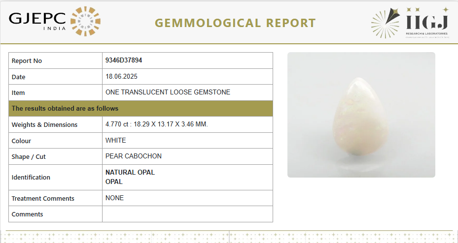 Gracefully shaped in a Pear Cabochon cut, this 5.30 Ratti (approx. 4.77 ct) Natural Fire Opal reflects elegance with its soft, translucent white hue and beautiful play-of-color. Certified by GJEPC-IIGJ, this opal is 100% natural and untreated, ideal for both stylish jewelry pieces and Vedic astrology use.