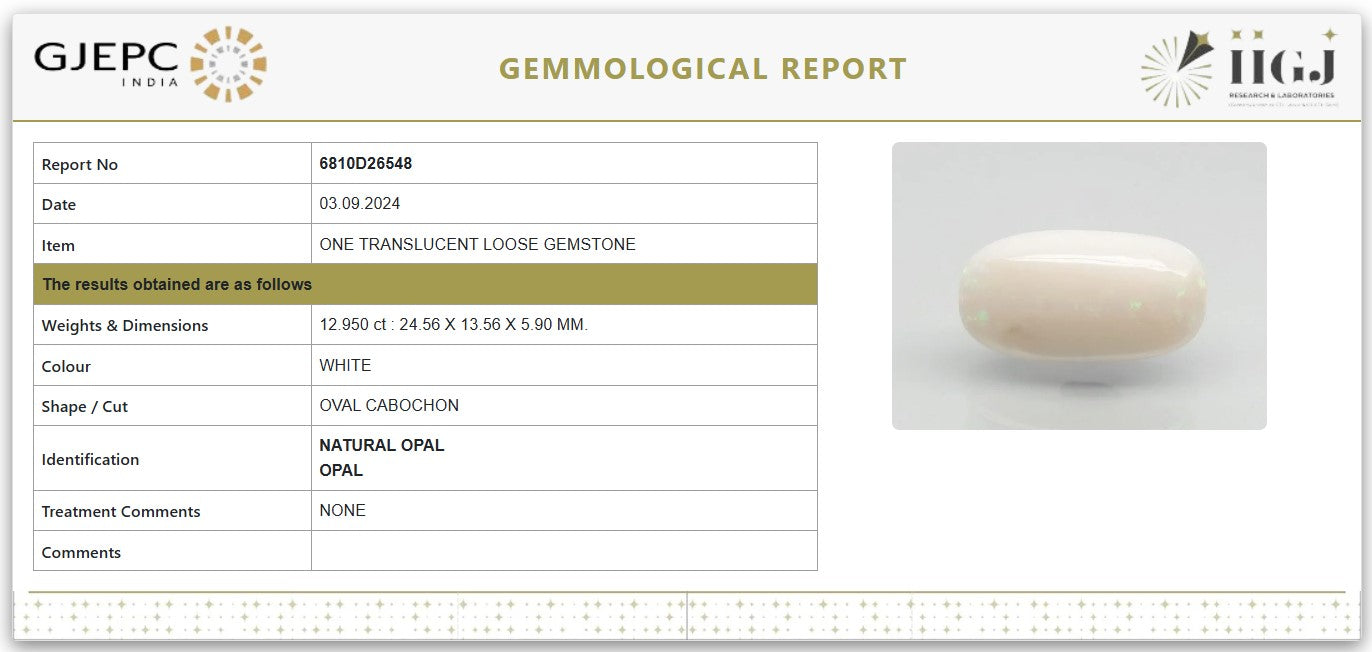 This 12.95 carat natural white opal is an exceptional gemstone with prominent iridescent flashes and a finely polished oval cabochon cut. Certified by IIGJ under GJEPC India, the gem is confirmed as untreated, preserving its natural optical play-of-color. Its larger size and excellent symmetry make it a rare choice for astrological or high-end jewelry purposes.
