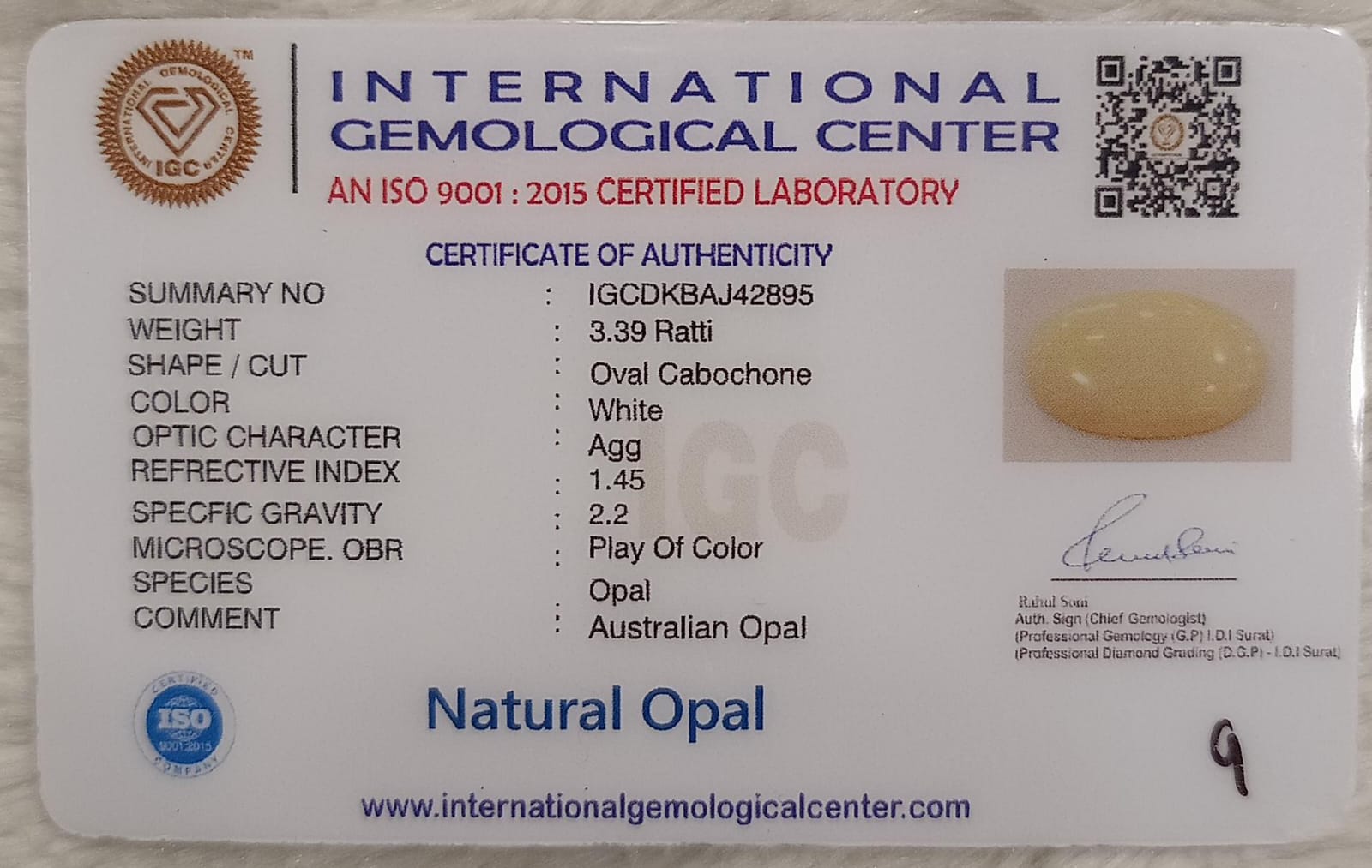Natural White Opal 3.33 Rat...Natural White Opal 3.39 Ratti| Oval Cabochone | Certified No. IGCDKBAJ42895