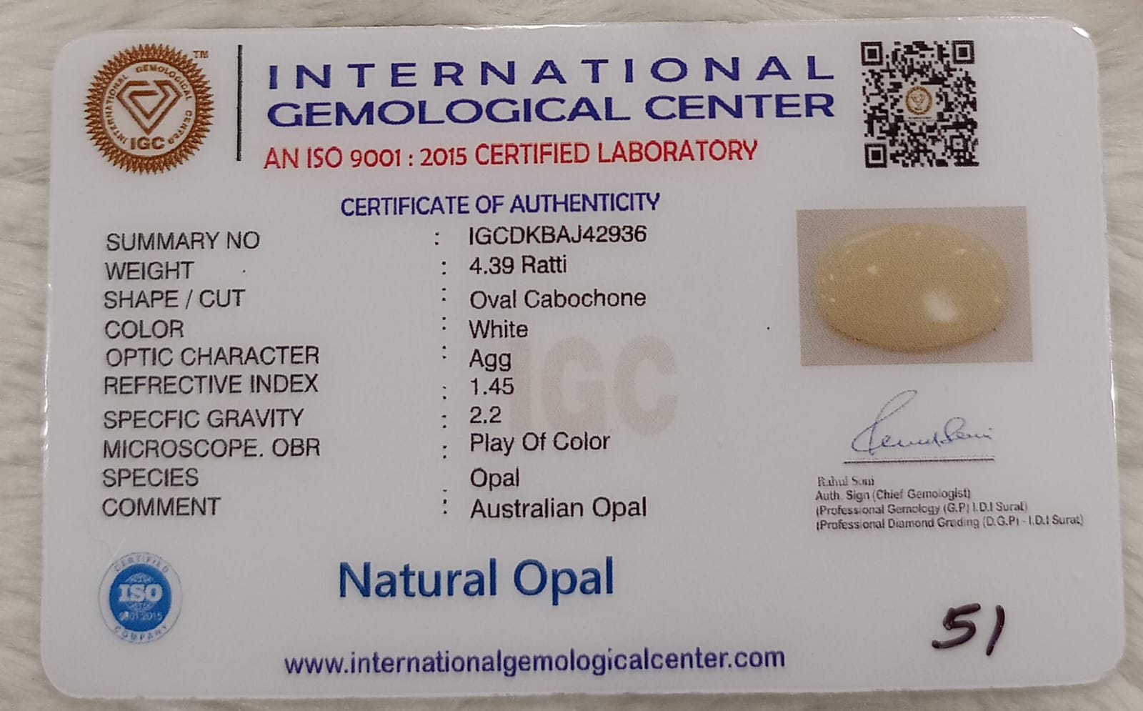 Natural White Opal 4.33 Rat...Natural White Opal 4.39 Ratti| Oval Cabochone | Certified No. IGCDKBAJ42936