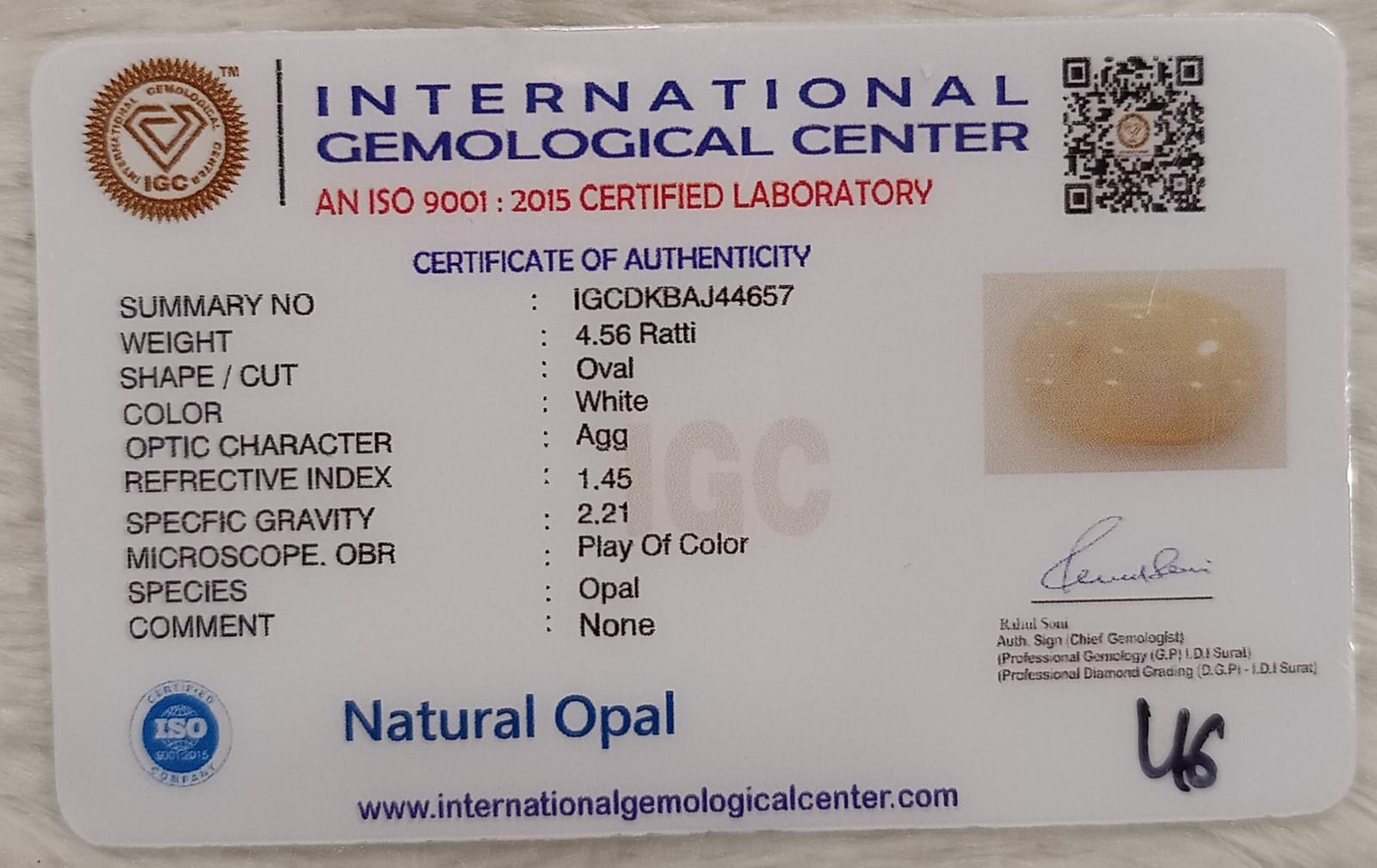 Natural White Opal 4.56 Ratti | Oval | Certified No. IGCDKBAJ44657