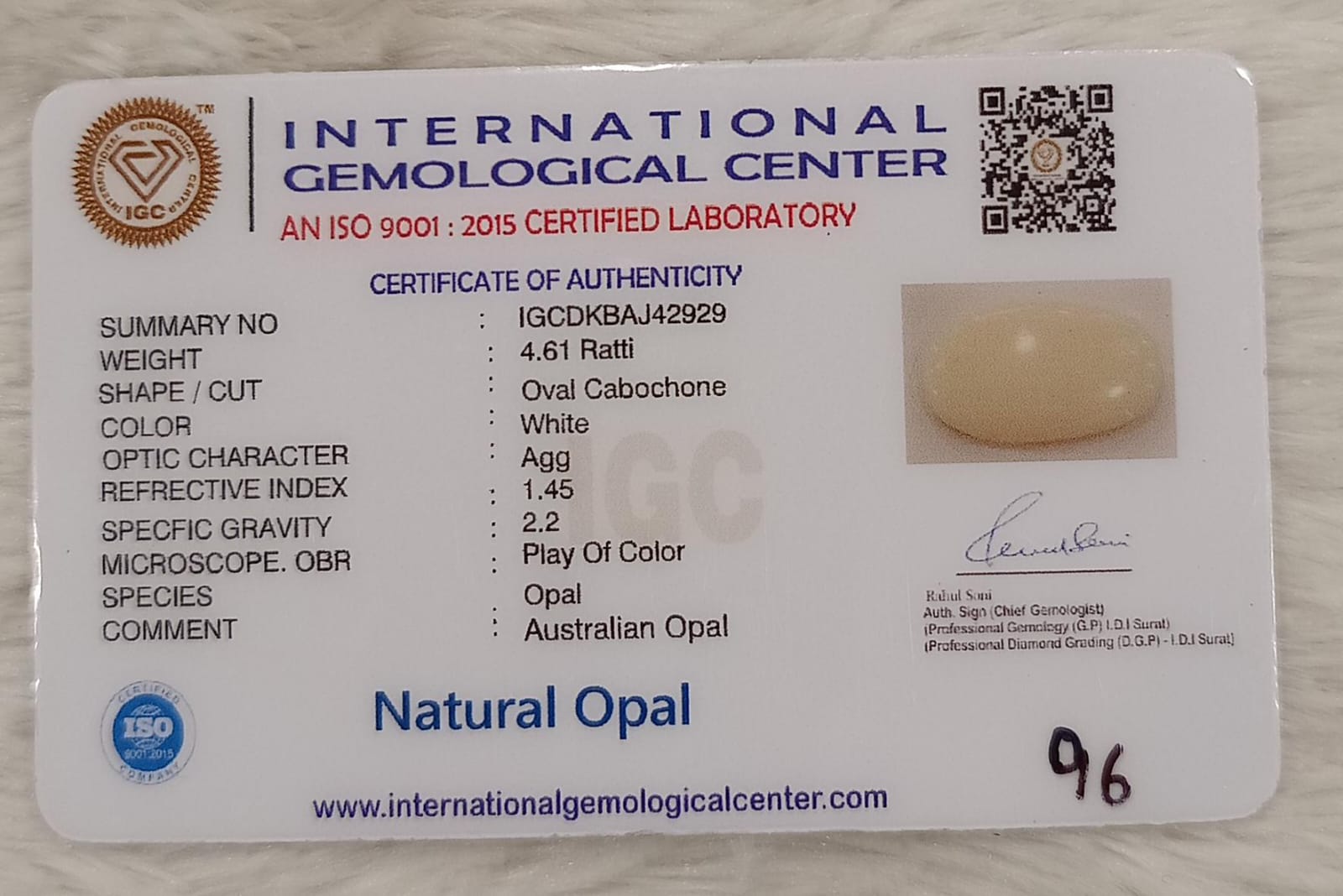Natural White Opal 4.56 Rat...Natural White Opal 4.61 Ratti| Oval Cabochone | Certified No. IGCDKBAJ42929