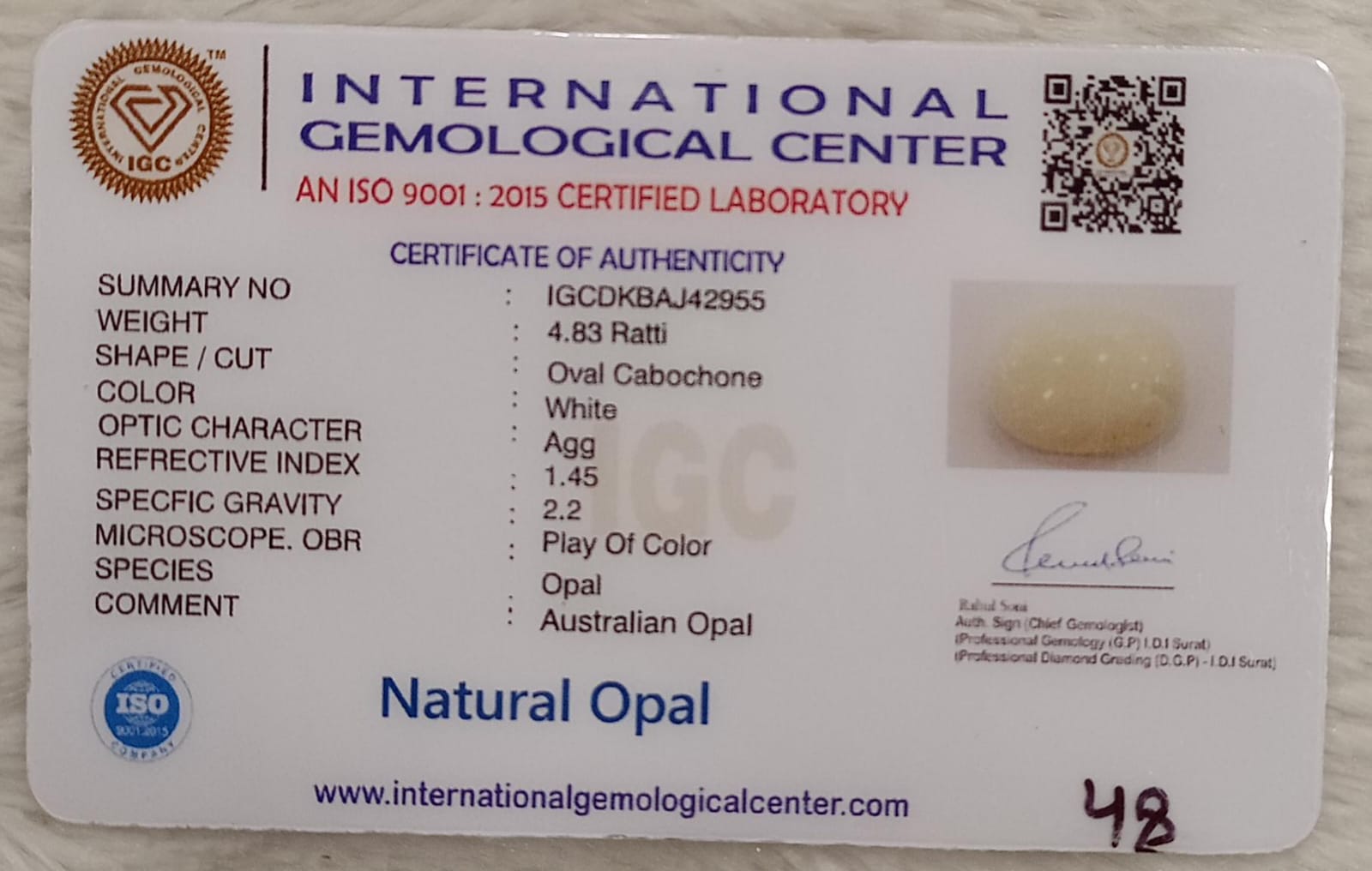 Natural White Opal 4.61 Rat...Natural White Opal 4.83 Ratti| Oval Cabochone | Certified No. IGCDKBAJ42955