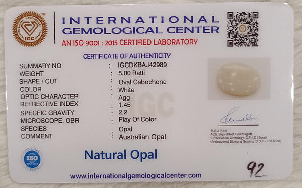 Natural White Opal 4.83 Rat...Natural White Opal 5.00Ratti| Oval Cabochone| Certified No. IGCDKBAJ42989