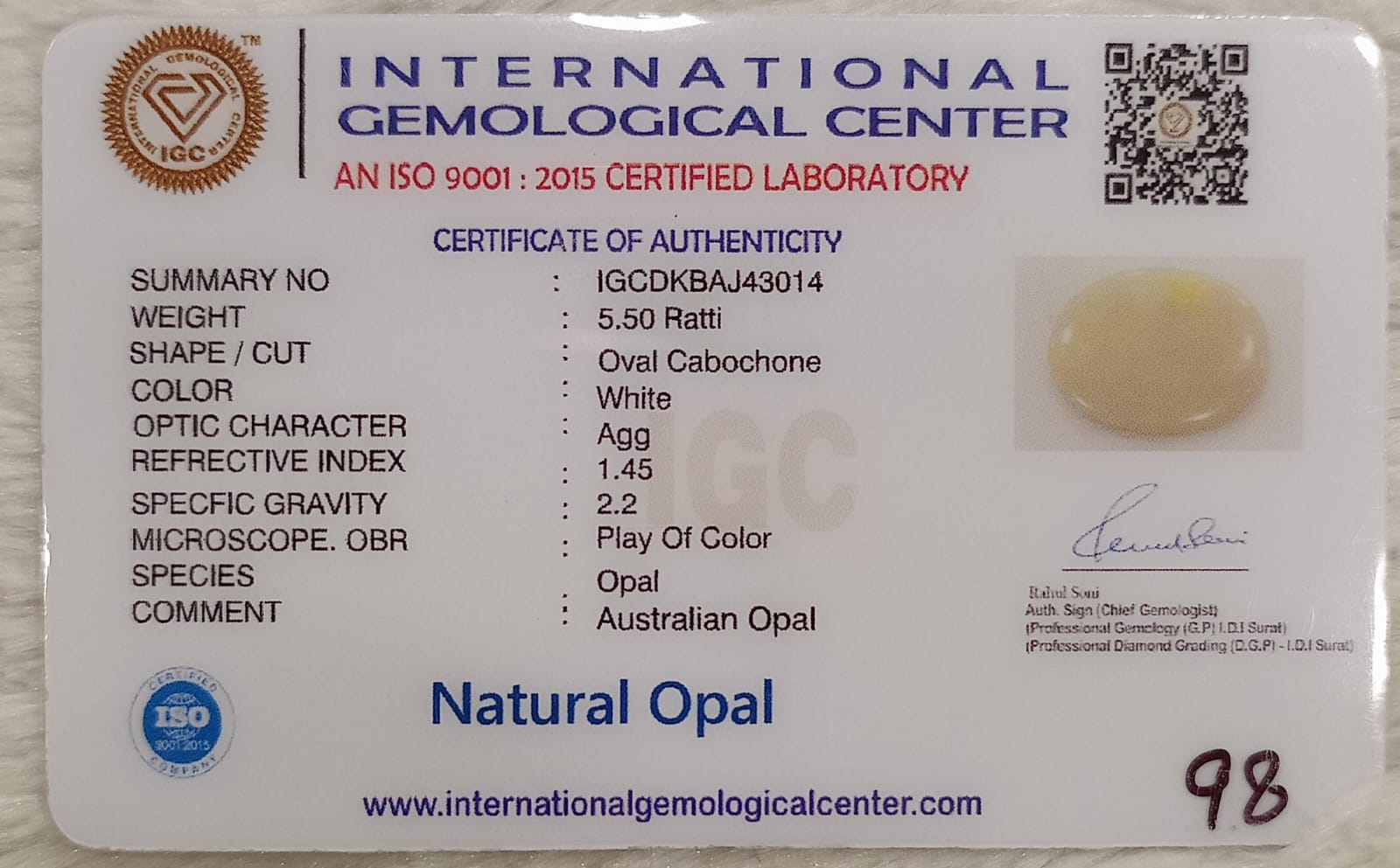 Natural White Opal 5.50Ra...Natural White Opal 5.50 Ratti| Oval Cabochone| Certified No. IGCDKBAJ43014